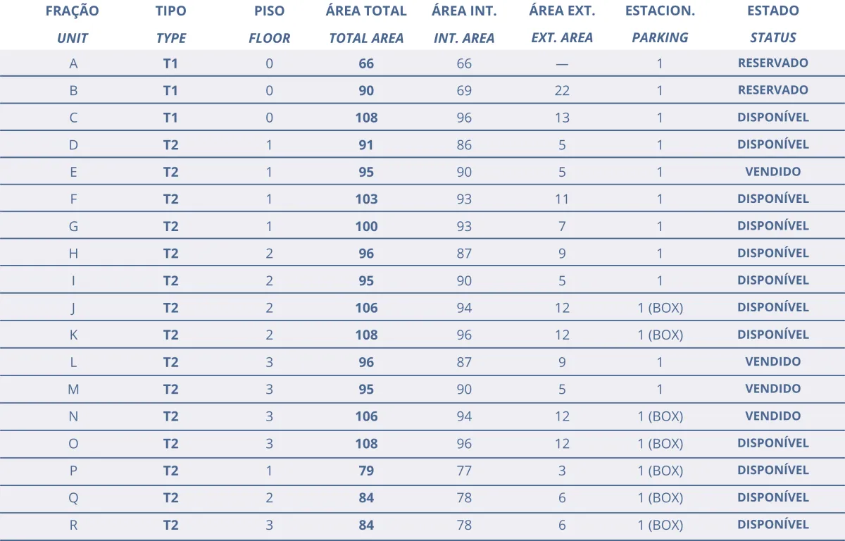 Constituído por 18 apartamentos de tipologias T1 e T2, com varanda ou terraço e lugar de estacionamento ou box.